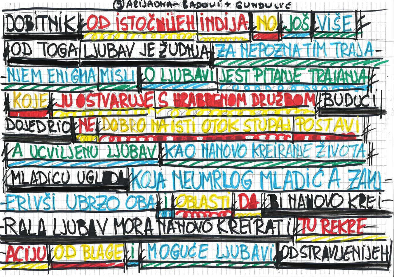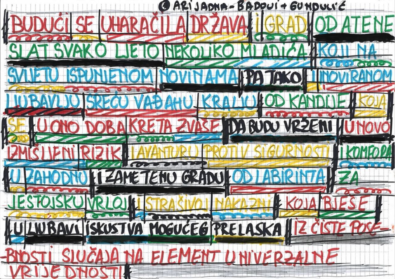 Autori: Damir Bartol Indoš & Tanja Vrvilo - Kuća ekstremnog muzičkog kazališta / KEMK. Premijera: 13. prosinca u 17 sati. Repriza 14. prosinca u 17 sati. Izložbena instalacija na 3. katu postava: do 21. prosinca. Sedma predstava iz sedmologije Kuće ekstremnog muzičkog kazališta, Arijadna prema motivima Dunje Robić proširuje tragove njezine verbalne glazbe Arijadnom Ivana Gundulića, čiji je izvornik djelo Arianna od Rinucinnija koji je prvotnu tragediju pretvorio u tragikomediju (Gundulićeva Arijadna može se označiti istom žanrovskom odrednicom). Glazbena partitura ekstremno muzičkog kazališta sadrži distorzične zvučne aluzije na Monteverdijev lamento O Teseo, Teseo mio i višeglasja Badouiove Pohvale ljubavi i pronađene krojne stihove tekstilne radnice i šivački prozni prolog Dubravke Ugrešić.