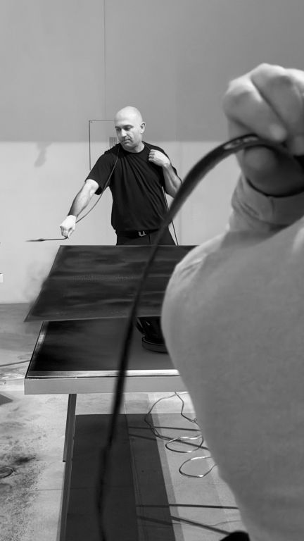 Radovi iz serije Otisci zvuka izvode se „kao višefazni proces. Na aluminijsku kompozitnu ploču nanosi se sirovi toner, na nju se učvršćuje pretvarač koji površinu čini zvučnom, a zvučni valovi potom pokreću čestice i oblikuju njihov raspored. Toner se fiksira kvarcnom lampom, a pod utjecajem topline ploča se blago savija i stvara topografiju slike. Ritam zvuka, vibracije i akustike prostora tako oblikuje sliku u vremenu kao otisak događaja. U tom smislu riječ je o procesnom pandanu montaži, jer se signal u ponavljanju i varijacijama prenamjenjuje u vizualni poredak, a recikliranje impulsa postaje ritam slike.“